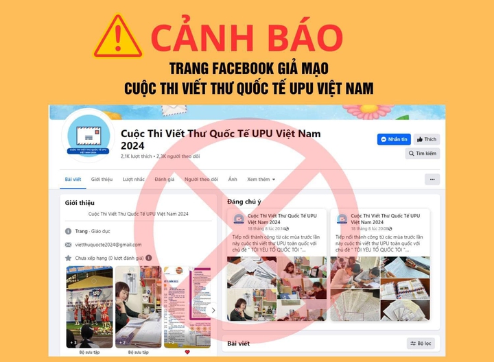 Tổng công ty Bưu điện Việt Nam vừa cảnh báo một số fanpage mạo danh cuộc thi viết thư quốc tế UPU, đăng thông tin về cuộc thi giả mạo và hứa hẹn giải thưởng hấp dẫn, từ đó dẫn dụ học sinh, phụ huynh đăng ký nhằm đánh cắp thông tin và tài sản.