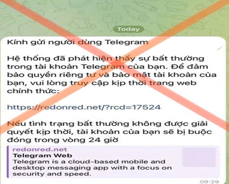 Nổi cộm gần đây, người dùng Telegram thường nhận được các tin nhắn lừa đảo có chứa đường Link, kèm nội dung yêu cầu như: “Bạn cần xác minh số điện thoại di động của mình”, “Vui lòng đăng nhập vào trang web chính thức để xác minh lại số điện thoại di động của bạn”,… Nội dung tin nhắn thường tạo cảm giác cấp bách, dụ người dùng làm theo yêu cầu. Khi truy cập vào đường Link trong tin nhắn, người dùng sẽ được yêu cầu đăng nhập tài khoản Telegram (số điện thoại) và cung cấp mã OTP; nếu làm theo, tài khoản của người dùng sẽ ngay lập tức bị chiếm đoạt.