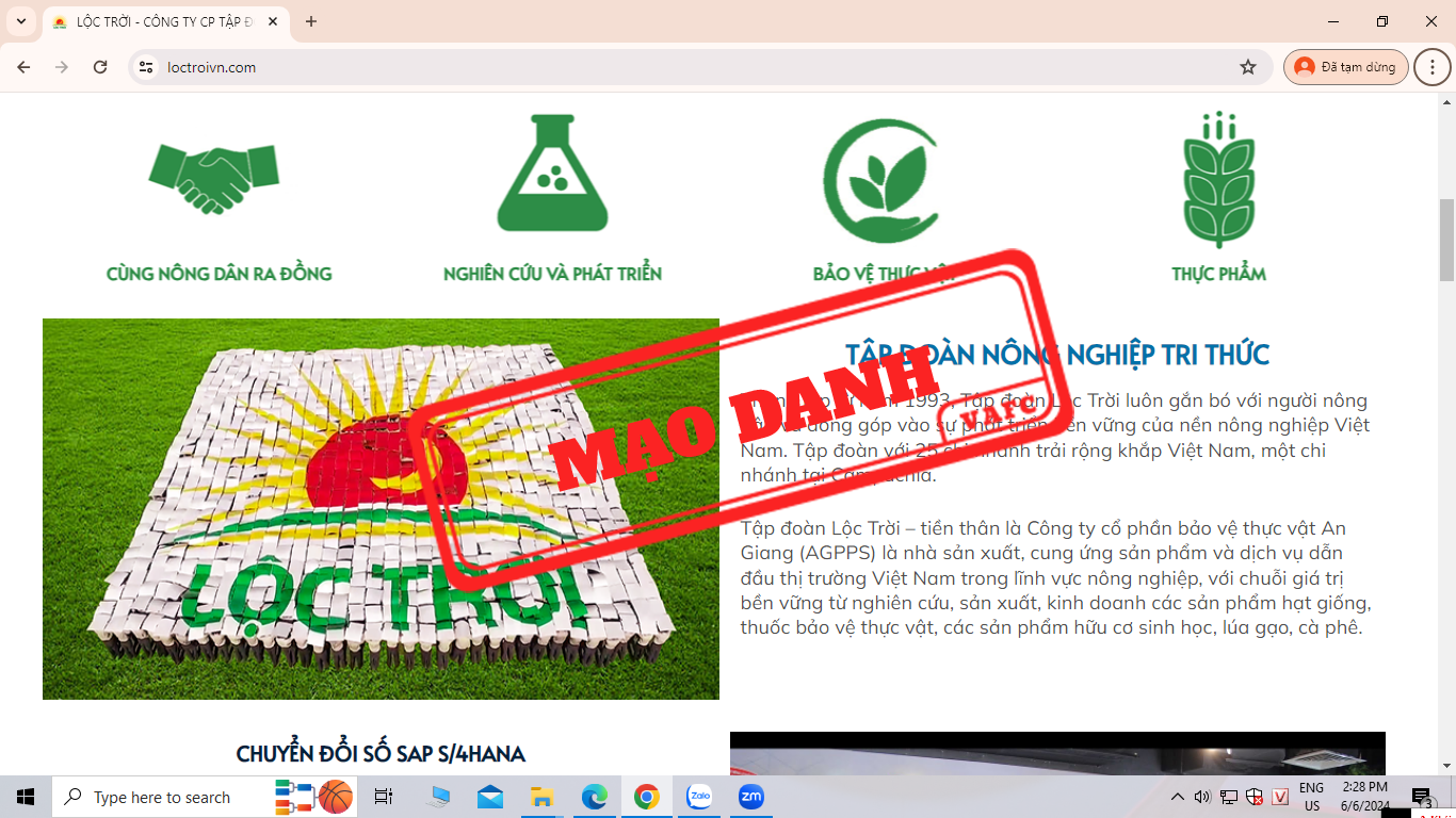 Cảnh báo: Website loctroivn.com giả mạo trang thông tin điện tử của Tập đoàn Lộc Trời
