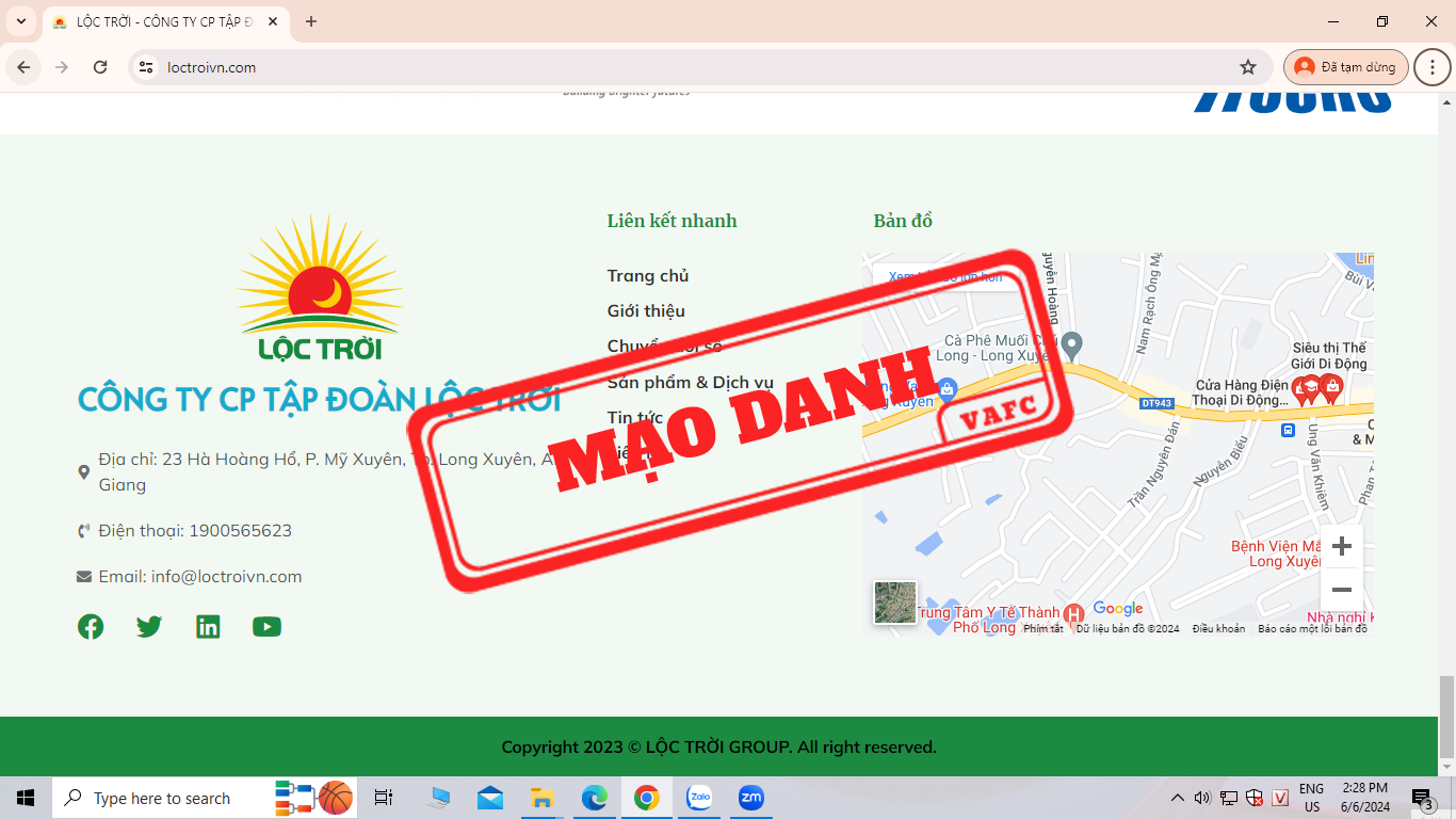 Trung tâm xử lý tin giả, thông tin xấu độc Việt Nam nhận được phản ánh của Công ty Cổ phần Tập đoàn Lộc Trời về việc trang thông tin điện tử tại tên miền https://loctroivn.com giả mạo trang thông tin điện tử của Tập đoàn lộc trời. Trang thông tin điện tử nêu trên sao chép gần như toàn bộ giao diện, các thông tin, hình ảnh, bài đăng… mà Tập đoàn Lộc Trời đăng tải, công bố trên trang thông tin điện tử chính thức của mình là loctroi.vn, điều này gây ảnh hưởng nghiêm trọng đến uy tín, danh dự, quyền và lợi ích hợp pháp của Tập Đoàn.