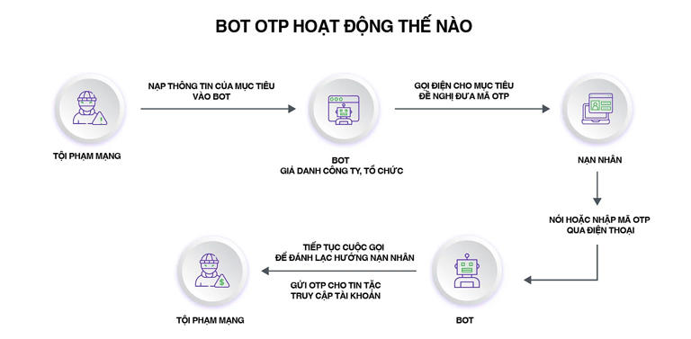OTP (mật khẩu dùng một lần) là hình thức bảo mật phổ biến, dùng trong xác thực hai yếu tố cho các tài khoản online. Mã này thường được gửi qua tin nhắn văn bản, email hoặc ứng dụng, nhằm đảm bảo đúng người dùng, tránh việc bị đánh cắp tài khoản ngay cả khi đã lộ tên đăng nhập và mật khẩu. Tuy nhiên với hình thức bot OTP mới, người dùng có thể vô tình cung cấp mã cho kẻ gian qua các cuộc gọi lừa đảo, mạo danh, từ đó bị xâm nhập tài khoản.