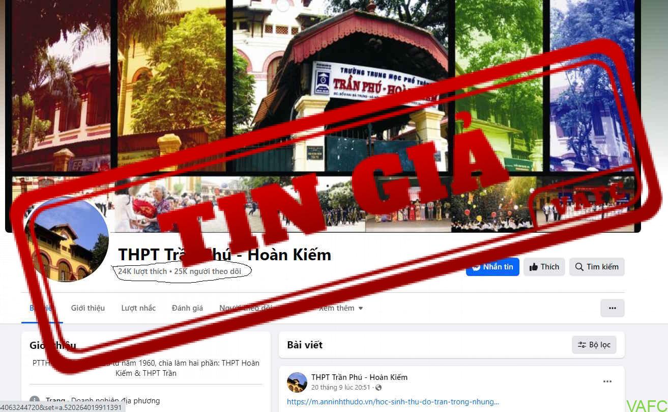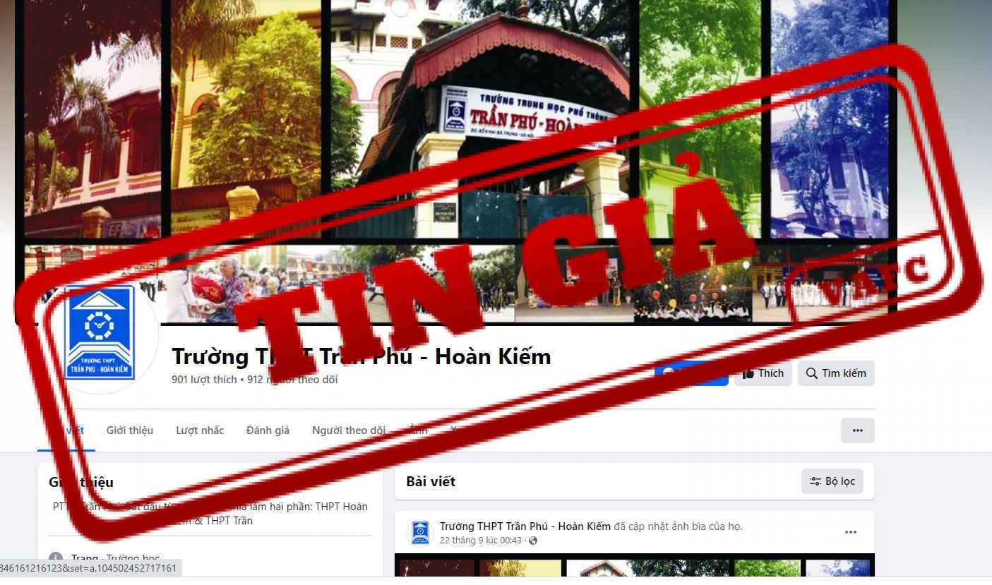 Trung tâm xử lý tin giả nhận được phản ánh của đại diện Trường THPT Trần Phú – Hoàn Kiếm về việc tồn tại 01 Fanpage không rõ người lập sử dụng các hình ảnh và sao chép các nội dung từ Fanpage chính thức của Trường, tiềm ẩn các rủi ro lừa đảo, bịa đặt, xuyên tạc gây ảnh hưởng đến hoạt động của Trường THPT Trần Phú – Hoàn Kiếm.