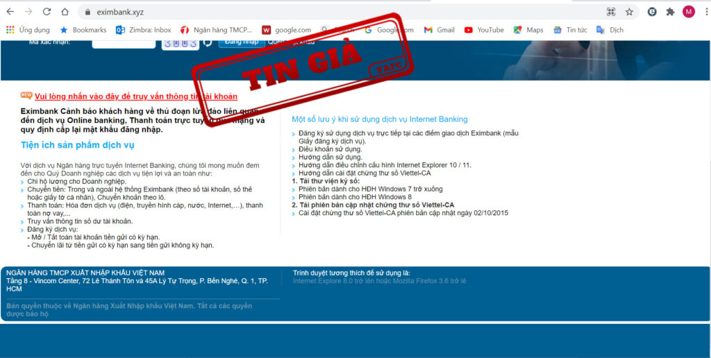 website eximbank.xyz đã giả mạo tên, hình ảnh của Ngân hàng Eximbank, đưa nhiều dịch vụ trên đó. Hiện, ngân hàng Eximbank có website chính thức đang triển khai tại tên miền https://www.eximbank.com.vn.