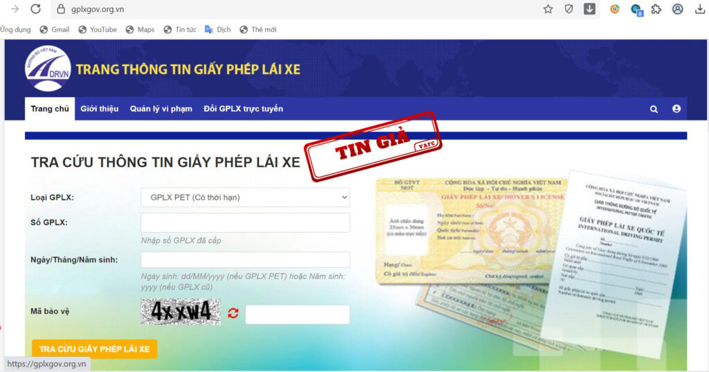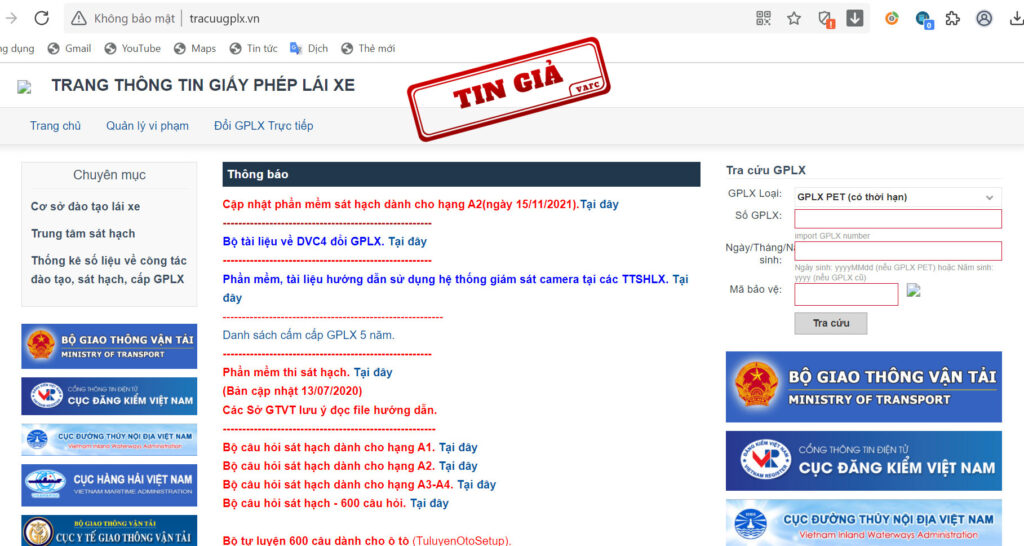 Giả mạo website tra cứu giấy phép lái xe của Tổng cục Đường bộ Việt Nam