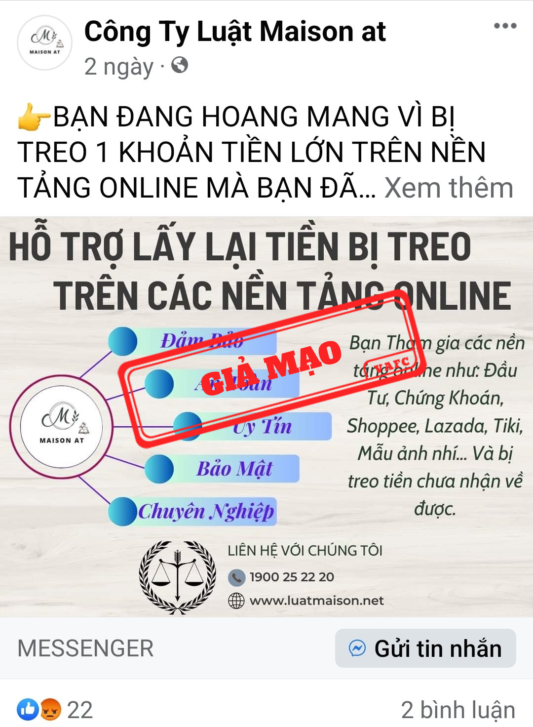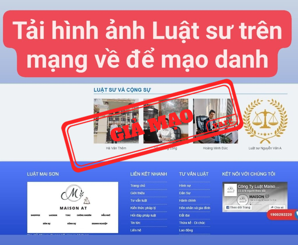 Trung tâm xử lý tin giả, thông tin xấu độc Việt Nam nhận được nhiều phản ánh của các Công ty Luật như: Công ty Luật TNHH Mai Sơn, Công ty Luật Bảo Ngọc, Văn phòng Luật sư Lê Nguyên Giáp, Công ty Luật Trí Minh,… trong đó, đều phản ánh về hiện tượng sao chép, lấy thông tin cá nhân, hình ảnh từ các tài khoản, trang, kênh mạng xã hội để thực hiện lừa đảo. Trung tâm xử lý tin giả, thông tin xấu độc Việt Nam đang thực hiện các biện pháp để xử lý các tài khoản giả mạo.