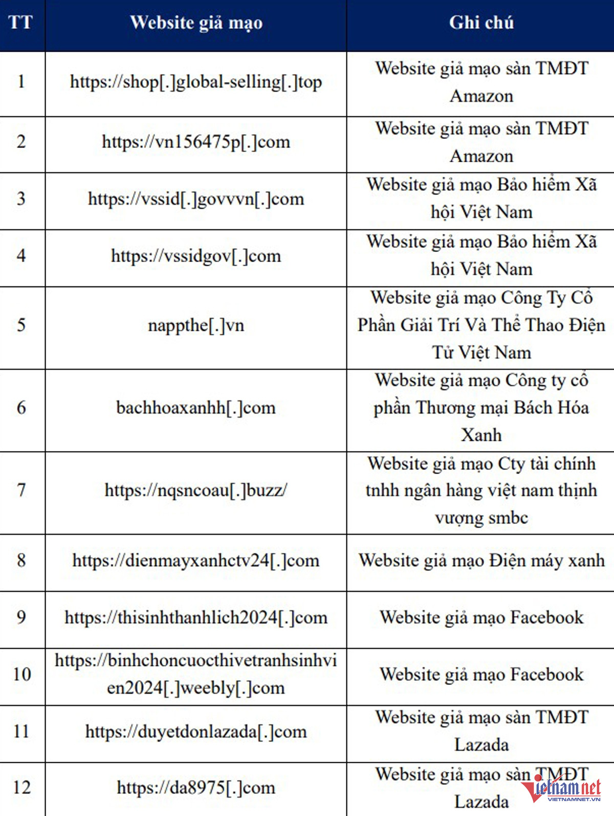 Danh sách website giả mạo bị phát hiện trong tháng 6/2024, vừa được Cục An toàn thông tin công bố rộng rãi để người dân cảnh giác. Ảnh: NCSC