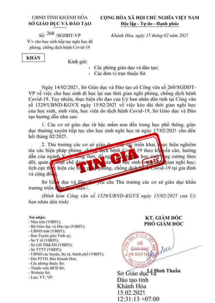 Thông tin "học sinh tỉnh Khánh Hòa được nghỉ học đến hết tháng 2 năm 2021" là tin giả