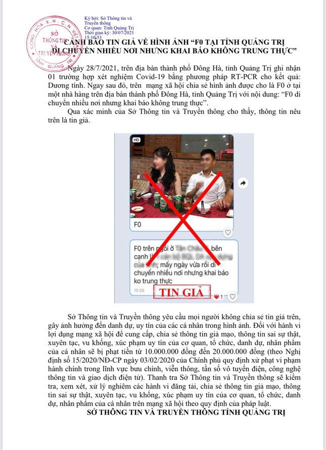 Ngày 30/7, Sở Thông tin và Truyền thông Quảng Trị cảnh báo, yêu cầu người dân không chia sẻ thông tin về việc “F0 Quảng Trị di chuyển nhiều nơi song không khai báo trung thực”, bởi qua xác minh xác định đây là thông tin giả.