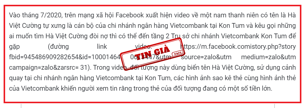 Vào tháng 7/2020, trên mạng xã hội Facebook xuất hiện video về một nam thanh niên có tên là Hà Việt Cường tự xưng là cán bộ của chi nhánh ngân hàng Vietcombank tại Kon Tum và kêu gọi những ai muốn tìm Hà Việt Cường đòi nợ thì có thể đến tầng 2 Trụ sở chi nhánh Vietcombank Kon Tum để gặp (đường link video: https://m.facebook.comistory.php?story fbid=945486909282654&id=10001464 0613447&utm source=zalo&utm medium=zalo&utm campaign=zalo&zarsrc= 31). Trong video, đối tượng này dùng biển tên Hà Việt Cường, sử dụng cảnh quay tại chi nhánh ngân hàng Vietcombank tại Kon Tum, các hình ảnh sao kê thẻ cùng hình ảnh thẻ của Vietcombank khiến người xem tin rằng trong thẻ của đối tượng đang có một số tiền lớn.