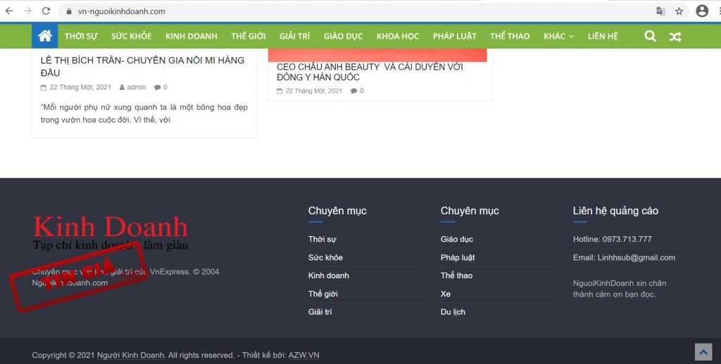 Qua kiểm tra, rà soát, Trung tâm Xử lý tin giả Việt Nam phát hiện trang thông tin điện tử: https://vn-nguoikinhdoanh.com/ có dấu hiệu giả mạo cơ quan báo chí khi đặt tên gọi là Tạp chí kinh doanh làm giàu Người kinh doanh. Ngoài ra, tại chân trang, trang này tự nhận là chuyên mục văn hóa, giải trí của Báo điện tử VnExpress. Trang https://vn-nguoikinhdoanh.com/ tổng hợp rất nhiều tin bài từ Báo VnExpress và đăng tải một số bài viết chủ yếu về nội dung dược mỹ phẩm, làm đẹp.