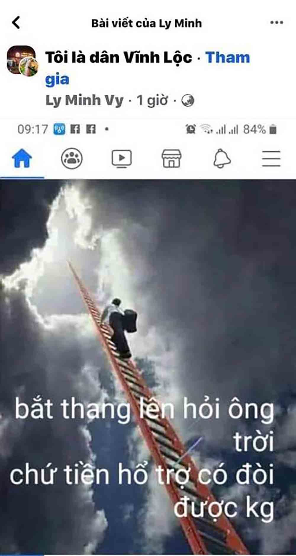 Ngày 8/8 vừa qua, ông Vỹ sử dụng tài khoản facebook cá nhân có tên “Ly Minh Vy” đăng tải vào nhóm Facebook tên “Tôi là dân Vĩnh Lộc” một bài viết có hình ảnh một người leo thang hướng lên trời và có dòng chữ “bắc thang lên hỏi ông trời. Chứ tiền hỗ trợ có đòi được không”.