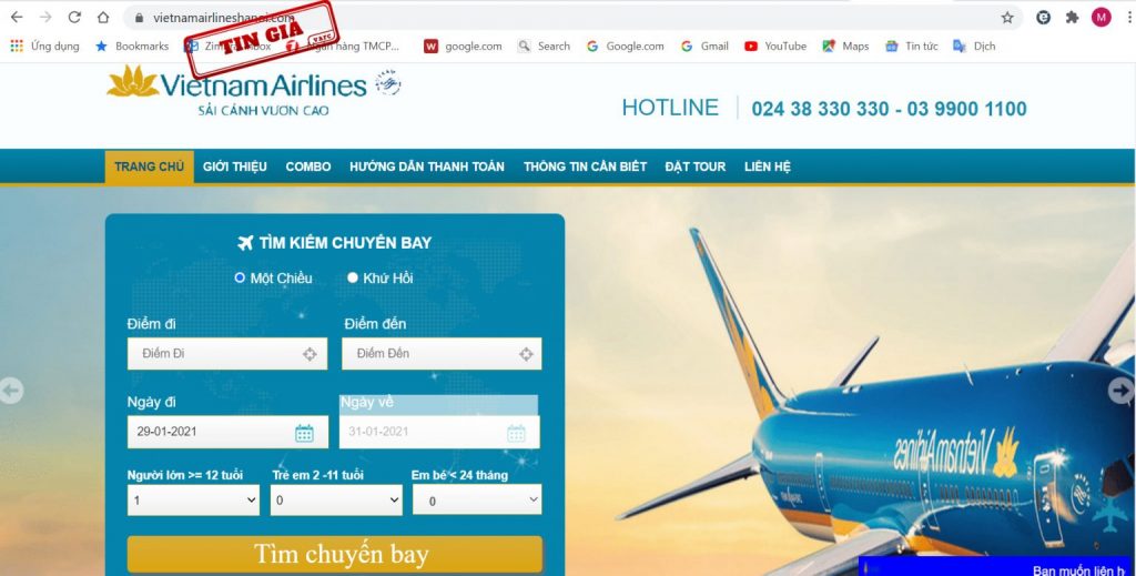 Ngày 27/01/2021, Cục Phát thanh, truyền hình và thông tin điện tử tiếp tục nhận được văn bản số 62/TCTHK-TT của Tổng Công ty Hàng không Việt Nam (Vietnam Airlines) phản ánh website có tên miền www.vietnamairlineshanoi.com cũng làm giả website www.vietnamairlines.com của Vietnam Airlines. Trước đó, ngày 16/01/2021, Trung tâm xử lý tin giả Việt Nam (VAFC) đã công bố một website www.vietnamairslines.com làm giả website www.vietnamairlines.com của Vietnam Airlines. Tính đến thời điểm này, Vietnam Airlines đã xác nhận có 02 website www.vietnamairslines.com và www.vietnamairlineshanoi.com làm giả website chính thức vietnamairlines.com của Vietnam Airlines, đồng thời, đã đề nghị cơ quan quản lý nhà nước xem xét xử lý vi phạm vì website này đã sử dụng hình ảnh, nhãn hiệu của Vietnam Airlines để gây nhầm lẫn cho khách hàng. Cục Phát thanh, truyền hình và thông tin điện tử sẽ chuyển vụ việc này đến cơ quan có thẩm quyền để xem xét xử lý theo luật định hiện hành.